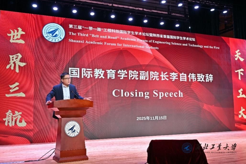 2025年11月15日,由西北工业大学国际教育学院主办的感知中国——第三届“一带一路”工程科技国际学生学术论坛暨陕西省首届国际学生学术论坛顺利召开。来自哈尔滨工业大学、北京理工大学、哈尔滨工程大学、南京航空航天大学、电子科技大学、西安交通大学和西安电子科技大学等多所高校的国际学生与我校国际学生齐聚一堂,分享研究成果、碰撞思想火花、共探科技前沿。论坛设置主旨报告、6个分论坛及墙报交流环节,500余名留学生参加了本次论坛,百余位留学生汇报了各自的学术成果。