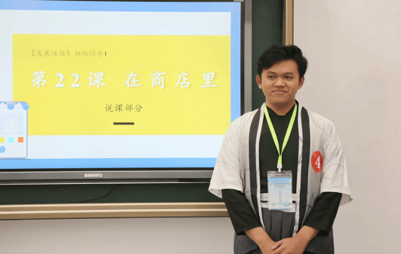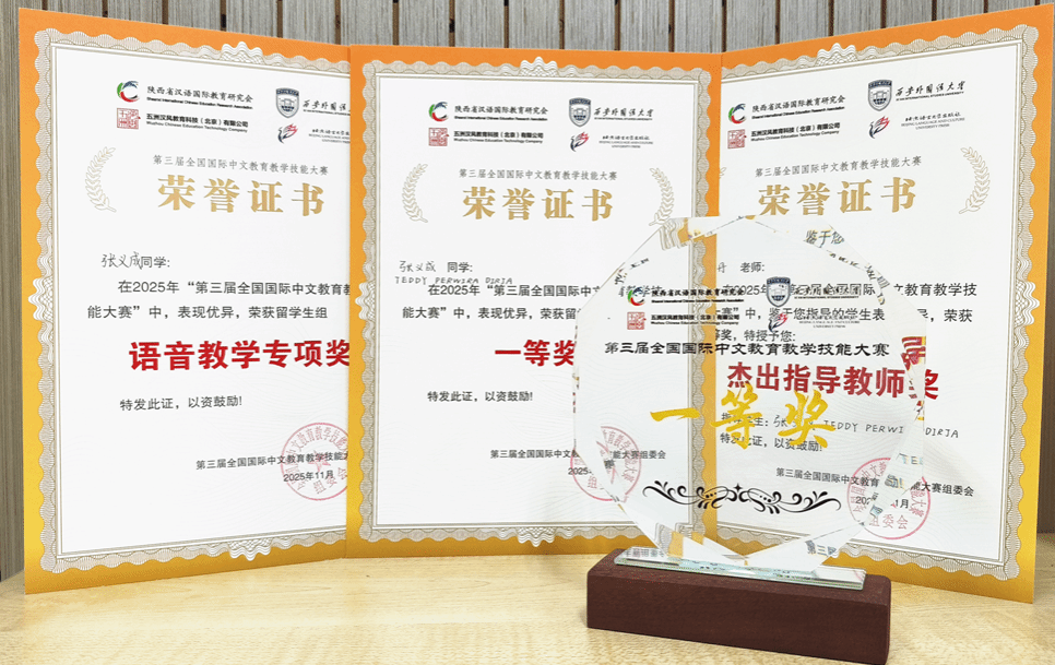 在本次高水平赛事中,我校印度尼西亚留学生张义成(TEDDY PERWIRA DIRJA)表现优异,以精湛的教学技巧、精彩的才艺表演与丰富的文化积累,一举夺得留学生组“一等奖”及“语音教学专项奖”,我院教师李丹获“杰出指导教师奖”。