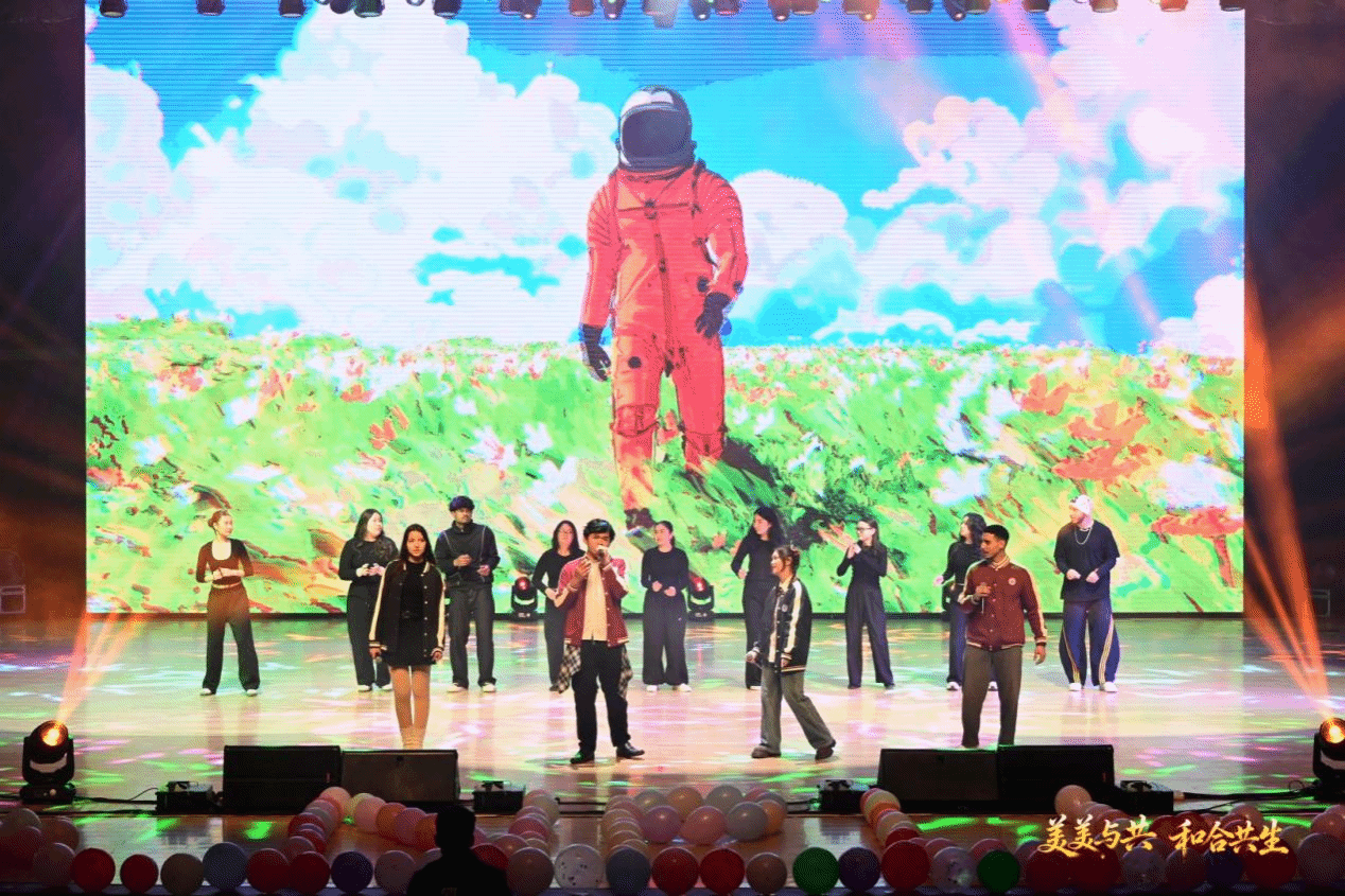 晚会共分为三个篇章,带领现场观众从充满民族特色的表演走向现代时尚的演绎,从意蕴悠长的独唱走向热情澎湃的乐队合奏,仿佛跨越五洲四海的广袤土地,沉浸在各国文化交织的瑰丽画卷里。每一个节目都是一次心灵的触动,让在场的师生深刻感受到多彩世界的深邃与活力。