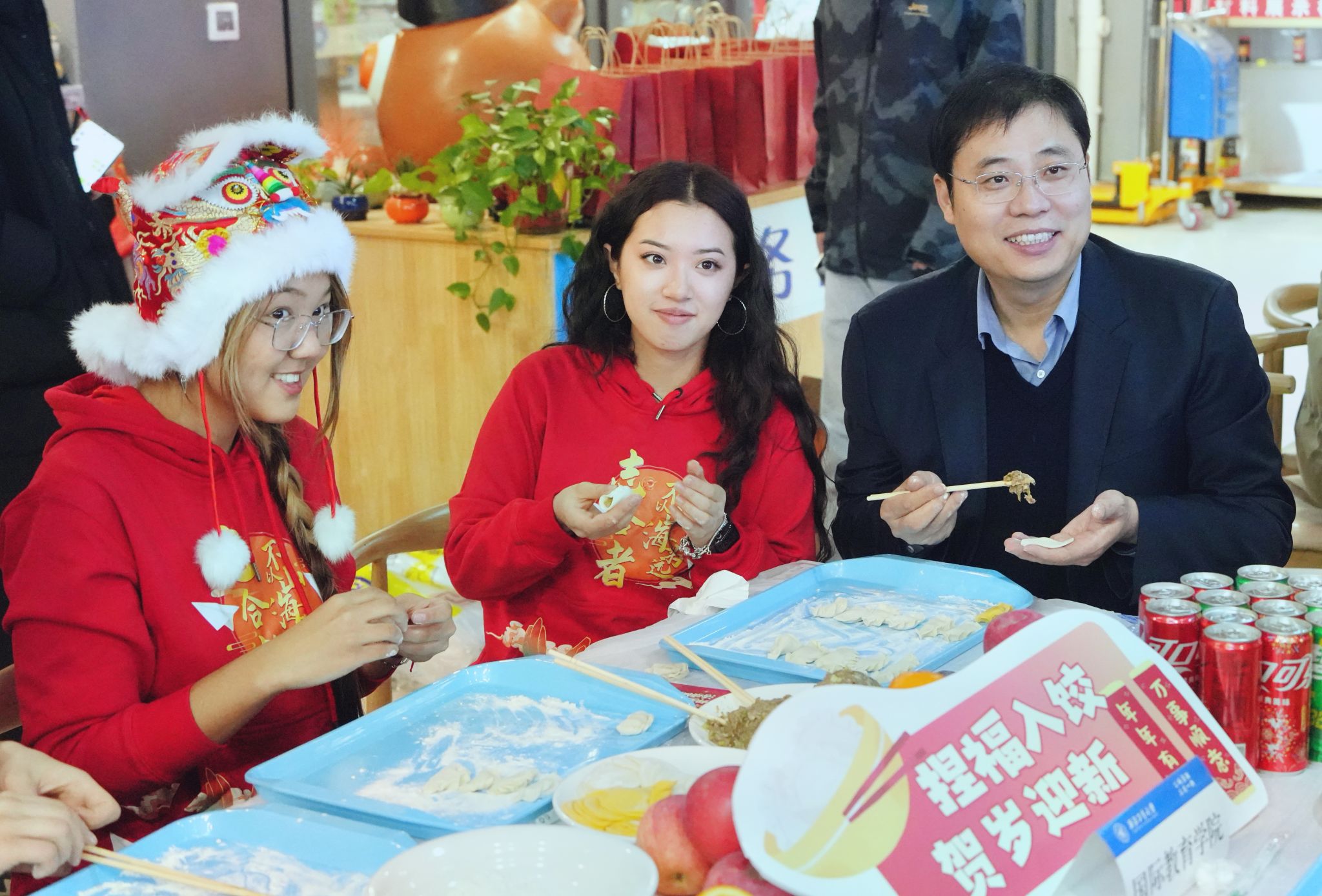 当晚,学校组织了盛大的跨年包饺子活动。学校党委书记李言荣,常务副书记吕卫东,副校长岳晓奎来到活动现场,与国际学生们共迎新年。师生互动频繁,气氛热烈。不少国际学生身着红色的喜庆服饰,在老师和同学的帮助下,兴致勃勃地体验填馅、捏褶等制作环节。虽然大家的手法略显生疏,但在共同努力下,一个个形态各异、象征着团圆与吉祥的饺子逐渐成型。校领导走到国际学生中间,亲切询问国际学生的学习生活情况,并致以新年的问候。老师和国际学生们围坐在一起,现场洋溢着其乐融融的节日氛围。